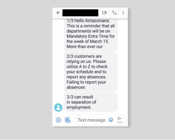 根据Athena获得的另一条信息,员工还被要求“必须加班”。亚马逊在这一信息中称,如果员工不加班,又不请假,就意味着“离职”。亚马逊发言人没有披露有关“离职”的详细信息。