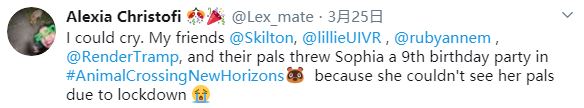 “我快感动哭了,我的朋友们和他们的小伙伴一起,为 Sophia 在《集合啦!动物森友会》中举办了她的9岁生日聚会,因为隔离她无法和自己的小伙伴见面。”