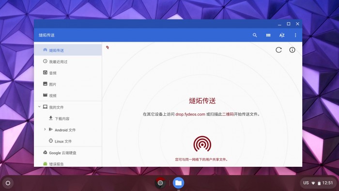 在“文件”app 中内嵌了对“燧炻传送”的支持,让你更方便地与其它设备在局域网内传送文件。只需要在同一内网下的其它设备上访问 drop.fydeos.com 即可自动建立连接。