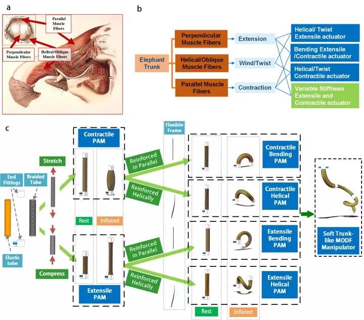 上述研究团队受到象鼻的启发,基于气动人工肌肉(Pneumatic artificial muscles,PAMs),研制出了一种新型柔性机器人。