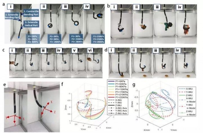 在此基础之上,研究团队通过一个仿象鼻的高自由度柔性臂来探索 HE-PAMs/HC-PAMs 在柔性机器人领域的潜在应用。研究人员表示,HC-PAMs 输出、负载能力很强,而 HE-PAMs 可产生更多的变形。