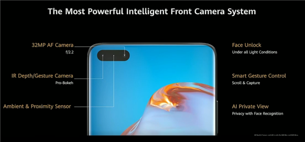 回到正面,P40 Pro左上角预留了挖孔,内藏自动变焦3200万像素前置镜头(P40是定焦)、红外/姿态传感器、距离/环境光传感器等,除了强大的自拍,还能在暗光下快速人脸解锁,识别手势以及AI感知智能亮屏等。