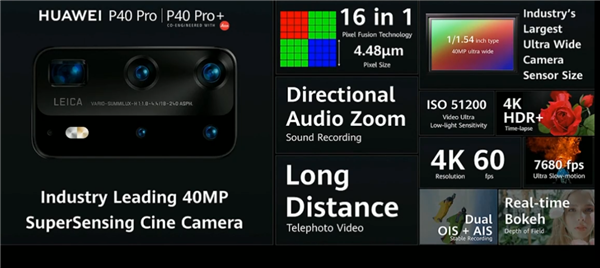 4000万电影镜头对比Mate 30 Pro上的那颗也做了改进,拜耳阵列可16像素合一成4.48μm,支持指向性音频变焦等。