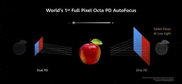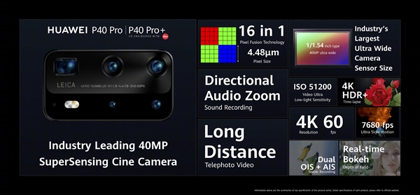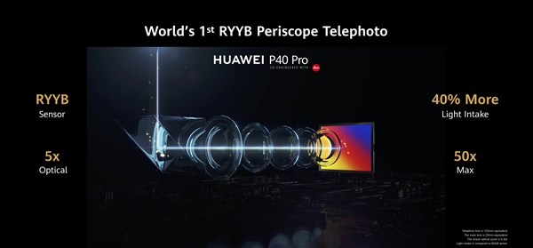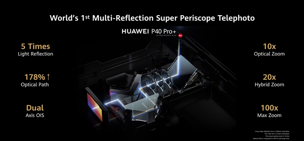 P40 Pro+使用了世界上第一个RYYB潜望式长焦镜头,支持5倍光学变焦、50倍数码变焦,进光量增大40%,世界上第一个多重反射超级潜望镜长焦镜头系统,光反射量提升5倍,支持10倍光学变焦、20倍混合变焦、100倍数码变焦,还支持世界第一个全像素八PD自动对焦系统,低光环境对焦更准确,另外ISO范围最高达409600。