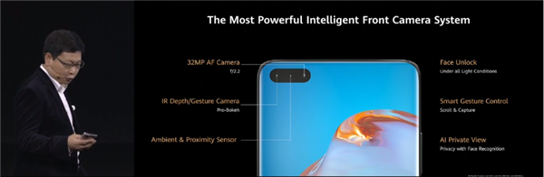 前置3200万像素主摄(F2.2),可拍摄4K视频,外加IR红外深度/姿态摄像头(二者中间是环境光与距离传感器),支持全场景人脸识别解锁、智能姿态控制(隔空操作等)、AI隐私模式。