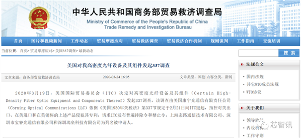 3月24日,中国据商务部网站发布信息称,当地时间2020年3月19日,美国国际贸易委员会(USITC)决定对高密度光纤设备及其组件(Certain High-Density Fiber Optic Equipment and Components Thereof)发起“337调查”。中国企业上海态路通信技术有限公司、深圳市宝睿光通信有限公司和瑦垒科技(深圳)有限公司涉及其中。