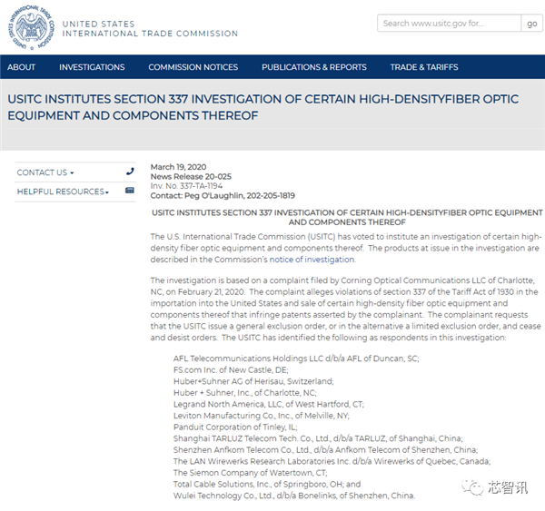 根据USITC网站上公布的信息显示,此次USITC发起的“337调查”是基于2020年2月21日美国北卡罗来纳州夏洛特市的康宁光学通信有限责任公司(Corning Optical Communications LLC)提起的投诉。