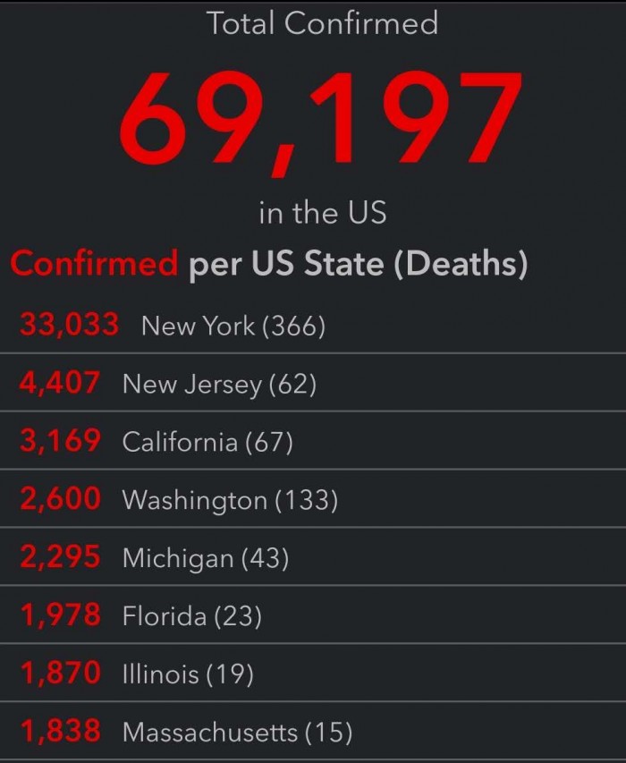 苹果大约三分之二的营收来自欧洲和美国。在这些国家正奋力抗击这场公共卫生危机之际,苹果面临的风险越来越大。随着酒店、航空公司、宾馆因为旅行禁令受挫,单是美国预计今年就会损失多达500万个就业岗位。根据美国约翰·霍普金斯大学发布的最新数据,美国现在的新冠病毒确诊病例为69,197例。