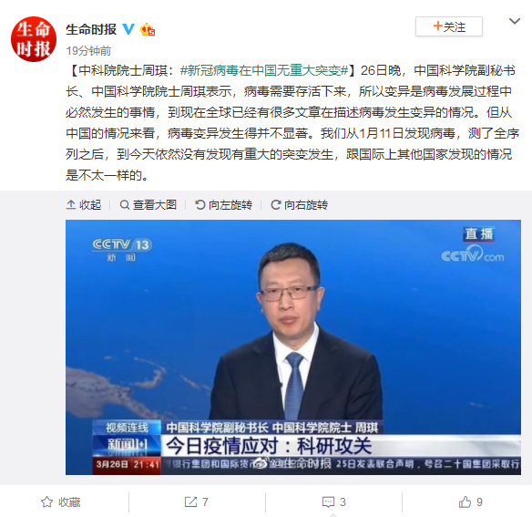 生命时报报道称,周琪院士表示病毒需要存活下来,所以变异是病毒发展过程中必然发生的事情,到现在全球已经有很多文章在描述病毒发生变异的情况。