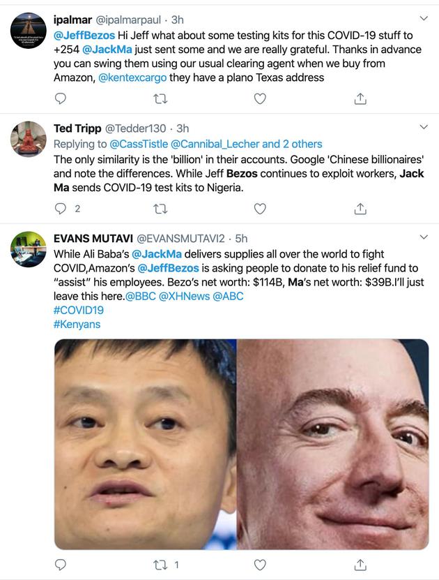 目前美国医护人员防护措施严重短缺,苹果、微软、谷歌、Facebook等巨头企业都已经纷纷捐款捐物,盖茨和马斯克等亿万富翁也个人出资提供试剂和呼吸机。在中国电商巨头马云宣布为美国捐出100万个口罩和50万个检测试剂盒之后,美国网友更是纷纷呼吁美国电商巨头贝索斯也能多少为美国提供一些帮助。贝索斯上个月刚刚抛售股票套现了34亿美元。