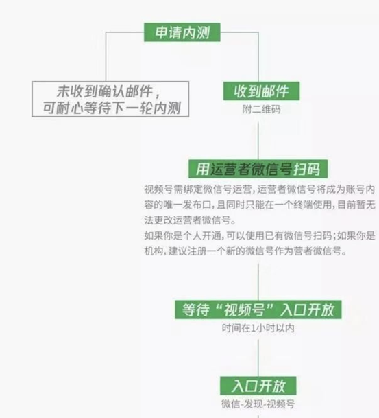 微信最初公告显示,内测期间,仅广州、成都、西安、沈阳等部分地区用户在微信发现页可看到“视频号”的入口。同时,用户可以通过发送邮件或扫描二维码方式,申请开通,不过申请之时,需要提供影响力证明。