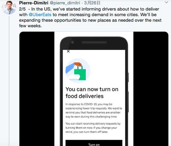 本月早些时候,UberEats免除了10万家独立餐厅的配送费。三月初,优步首席执行官Dara Khosrowshahi曾表示,受新型冠状病毒疫情的影响,该公司叫车业务在一定程度上会因为人们不再出门而受到冲击,但外卖送餐业务可能会受益。