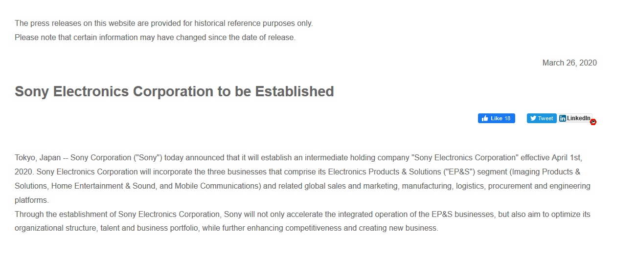 去年3月,索尼宣布将包括影像和移动在内的重要产业合并成立“消费电子和解决方案事业部”(EP&S)。而今天索尼公司再次发布公告,宣布对EP&S部门进行拆分,成立一家名为“索尼电子公司”(Sony Electronics Corporation)的中间控股公司。这项调整将于今年4月1日正式生效。