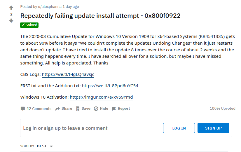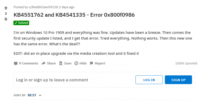 用户反馈称会收到“2020-03 Cumulative Update for Windows 10 Version 1909 for x64-based Systems (KB4541335) – Error 0x800f0831”以及“There were problems installing some updates, but we’ll try again later.”(安装某些更新时遇到问题,请稍后再试)的错误提醒。