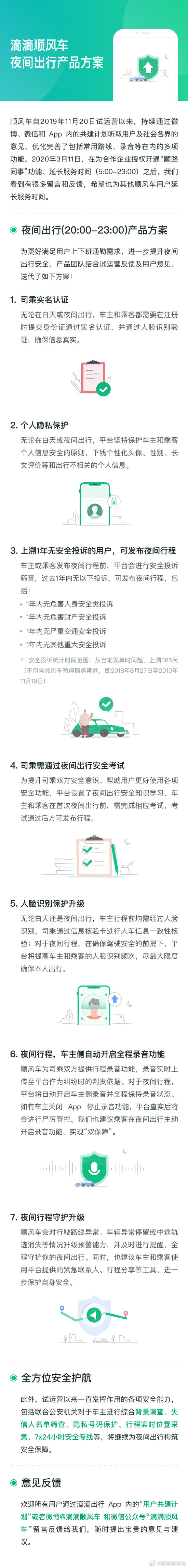 3月11日,滴滴顺风车称收到一些用户呼吁延长夜间使用时间的反馈,为了更好地满足更多用户上下班的通勤需求,进一步提升夜间出行安全性,滴滴顺风车团队结合试运营期间的用户反馈和建议,公布了夜间出行产品方案。
