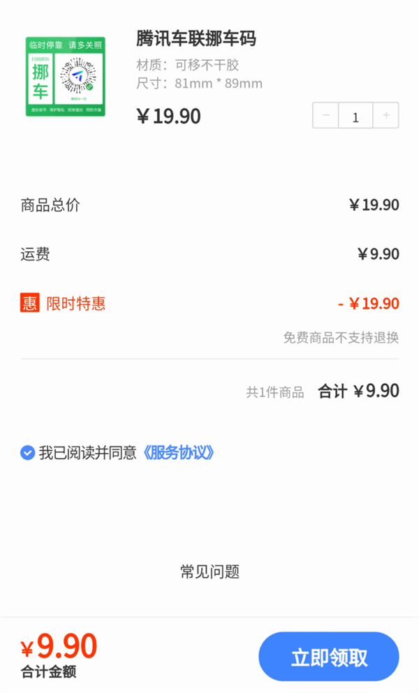 申请方式上,用户通过“腾讯我的车” 微信小程序,即可在“车主服务”一栏里在线申请。当前该挪车码推出限时特惠活动,减免19.9元,所有用户都可以免费申领,不过需支付9.9元邮费。