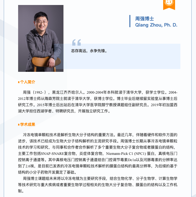 周强,出生于 1982 年,清华大学本硕博毕业,博士毕业后继续留实验室从事博士后研究工作;2015 年博士后出站后在清华大学医学院颜宁教授课题组任副研究员;2019 年初加盟西湖大学担任西湖学者、特聘研究员,开展独立研究工作。