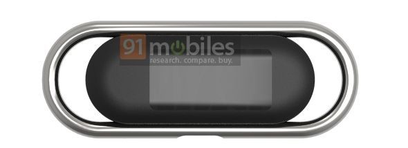 效果图显示产品本体位于较大的金属环内。这种设计非常独特,不容易理解。我们在金属环的左侧看到一个小凹槽,可能是通过压敏按钮来控制显示。环的末端可以连接到皮带上,以便将设备戴在手腕上。