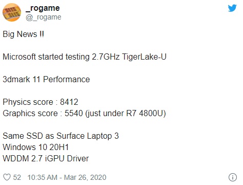 此前曾泄露过 Surface Go 2 基准测试成绩的 Twitter 网友 @_rogame,现在又爆料称英特尔正在测试一款基于英特尔 Tiger Lake-U 四核 2.7GHz 处理器的 Surface Laptop 机型。