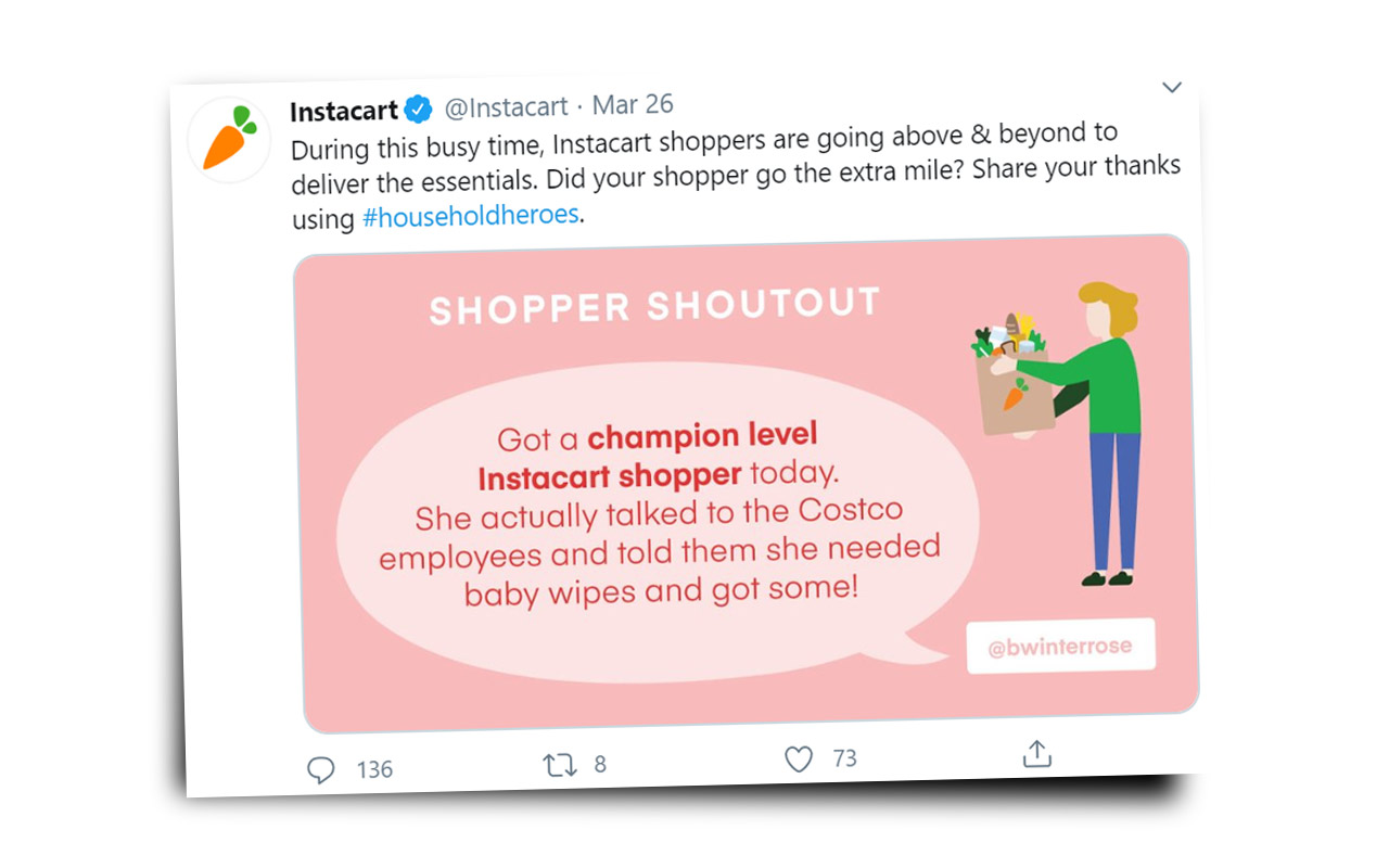 目前,Instacart制定了与COVID-19相关的政策,根据该政策,他们承诺向 Instacart Shoppers付款,如果确诊或将其隔离,则最多可以支付14天的费用。该政策将于4月8日到期。