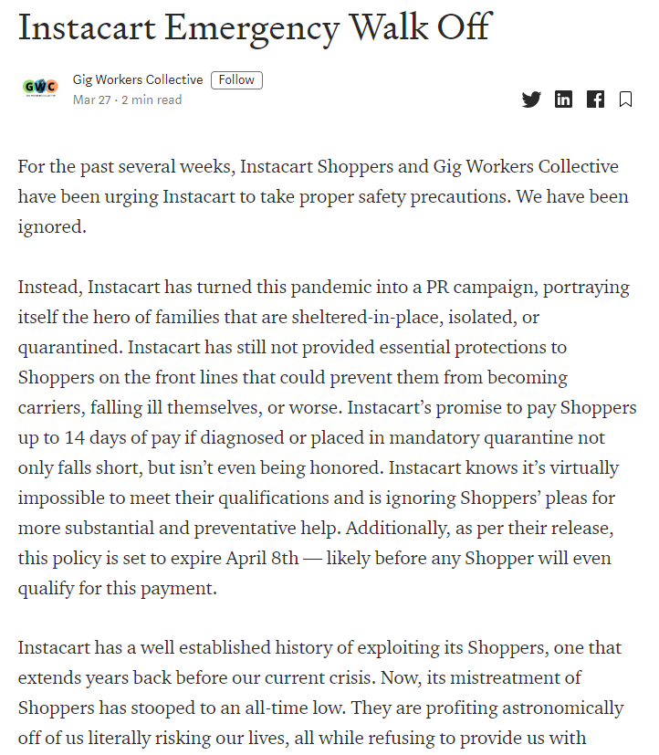 根据 Instacart Shoppers发布的一份声明, Instacart“拒绝为购物者,顾客和公共卫生的利益采取积极行动,因此我们被迫将事情交到自己手中。” 与Instacart合作的购物者将从2020年3月30日星期一 开始停止使用该平台 ,直到满足他们的要求为止。
