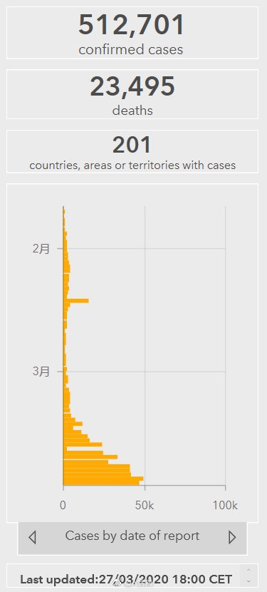 从目前疫情发展的情况看,美国已经成为了震中,当然欧洲的疫情扩散势头也没有停下来。世卫组织实时统计数据显示,截至欧洲中部时间3月27日18时(北京时间3月28日1时),全球确诊新冠肺炎512701例,死亡23495例,目前全球201个国家地区出现新冠肺炎病例,中国以外新冠肺炎确诊约43万例。