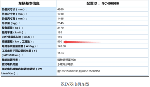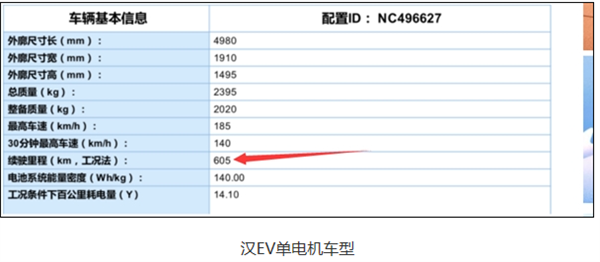 续航方面,汉EV单电机版车型的NEDC续航里程可达605km,双电机版车型的NEDC续航也达到550km。