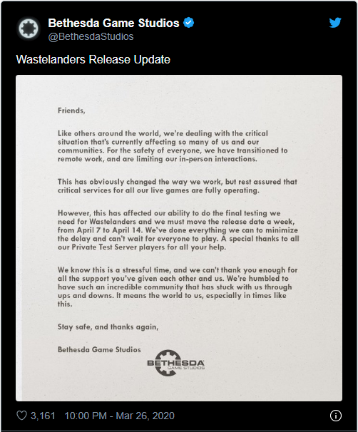 比如贝塞斯达就在《辐射 76》的社区公告中称:“受在家工作导致的效率减缓,其已将这个废土世界的大规模扩张计划推迟了一周”。