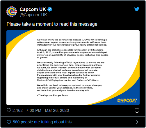 周四的时候,卡普空(Capcom)在一条推文中称:《生化危机 3》将于 4 月 3 日上市,但实体版交付可能有所延迟。