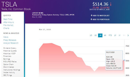 3月28日消息,据国外媒体报道,美股2月底到3月中旬大幅下滑,近期开始回升,电动汽车厂商特斯拉的股价,在经过2月底开始的一轮大跌之后,近期也开始回升。特斯拉股价在2月19日收盘时达到了917.42美元,但在随后一段时间大幅下滑,在3月18日收盘时跌到了361.22美元,不到最高时的四成。
