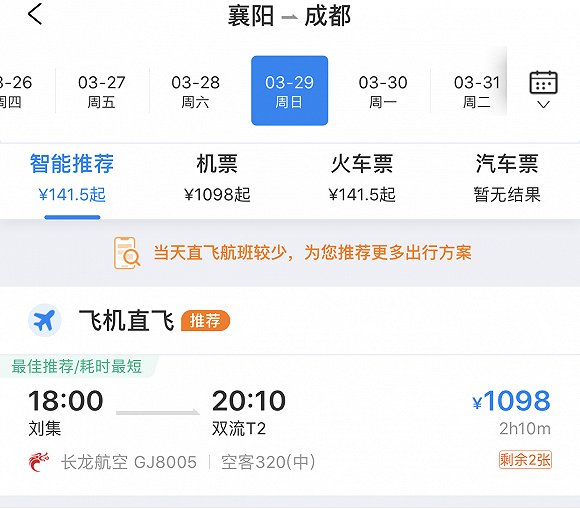 去哪儿网数据显示,3月29日湖北复航的首班航班为襄阳-深圳6:00起飞,由深圳航空执飞。截至3月28日11时,去哪儿网平台显示,该航班经济舱机票价格为1290元,但全价公务舱仅剩1张机票,价格为3610元。
