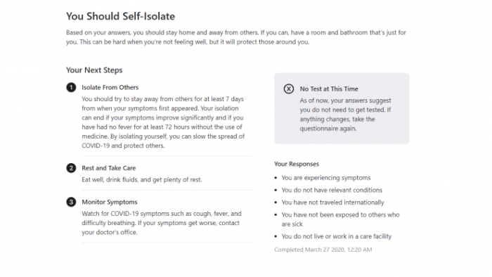 这款应用程序主要是苹果健康团队开发的,旨在帮助身在家中的人们获取可靠的信息从而保护自己。该网站包括一系列有关新型冠状病毒的注意事项、近期接触和相关症状的问题,为人们下一步该做什么提供了建议,比如此时是否建议进行检测,或者是否应该在家中进行自我隔离。