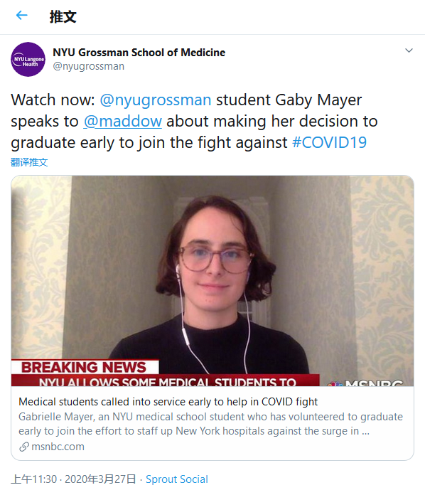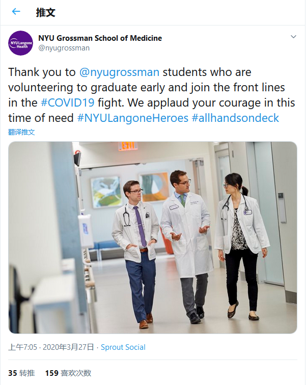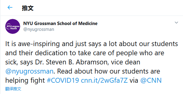 面对汹涌的新冠病毒疫情,美国出现了严重的医护人员短缺问题。为了缓解这个问题,纽约州决定让医学院学生尽早毕业并参与到这场战“疫”中。本周三,纽约大学格罗斯曼医学院在其官方推特上确认了这项举措:“很激动的宣布来自@NYSEDNews和#LCME这项等待批准的信息,@NYUGrossman将允许精选的医学生尽早毕业,以吸引更多的医生加入。让我们一起对抗新冠病毒疫情。”