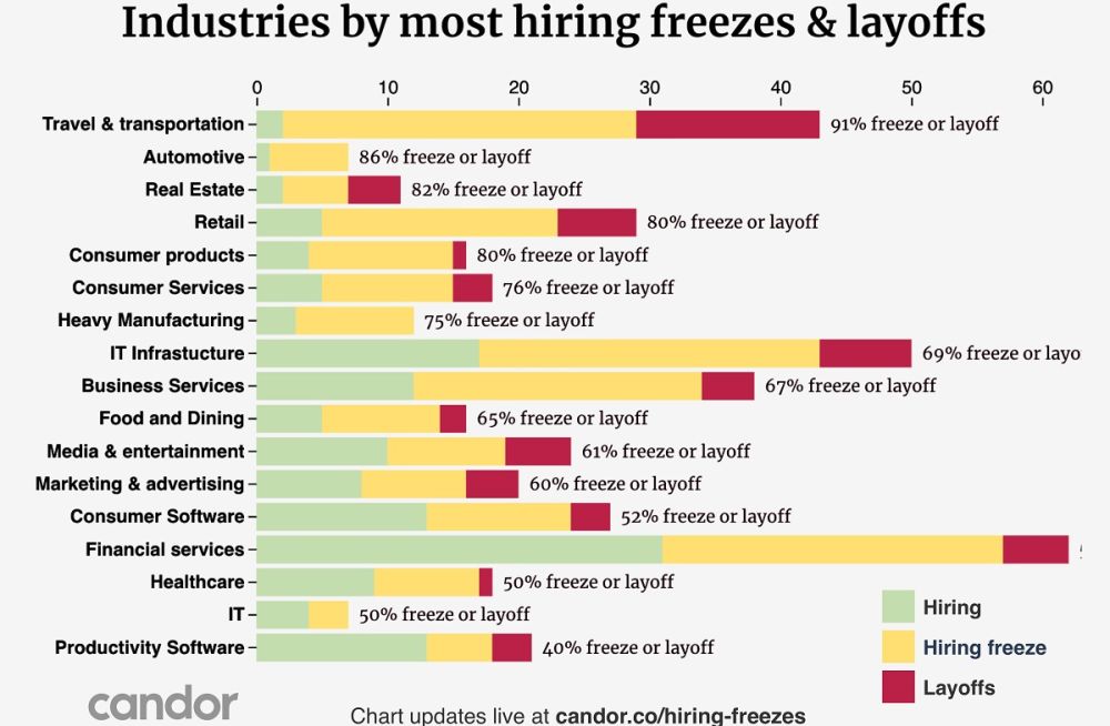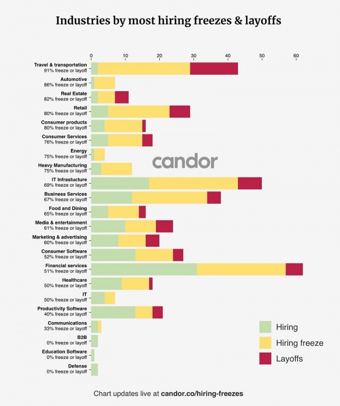 更新:目前报告中已增加至701家,具体可以访问https://candor.co/hiring-freezes/