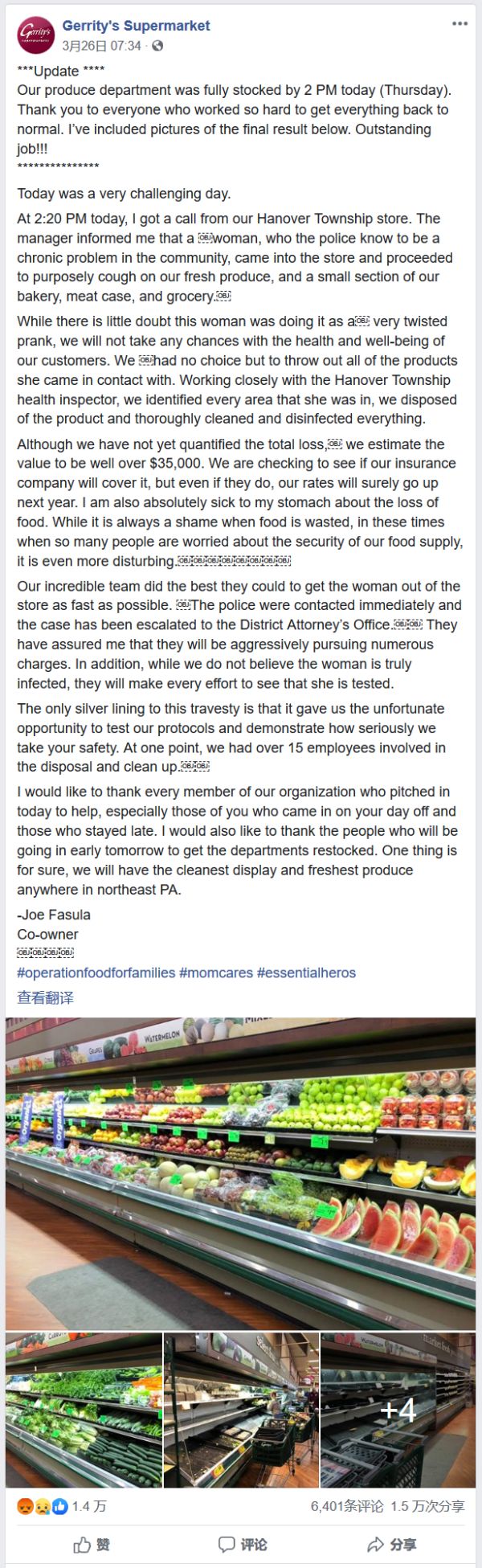 之后超市工作人员迅速报警,并将她带离了超市。超市负责人Joe Fasula估计,这位妇女纯粹是恶作剧,应该是没有感染新冠的。不过超市为顾客健康着想,决定将她接触过的所有货品全部丢掉,损失达3.5万美元。