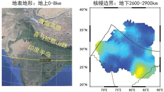 图5 研究区地形图及核幔边界速度变化图(结果速度变化图中:蓝色为高速,代表俯冲结构,黄色为低速,代表化学异常体或熔体。)(图片来源:左图来自谷歌地球,右图来自中科院青藏高原所。)