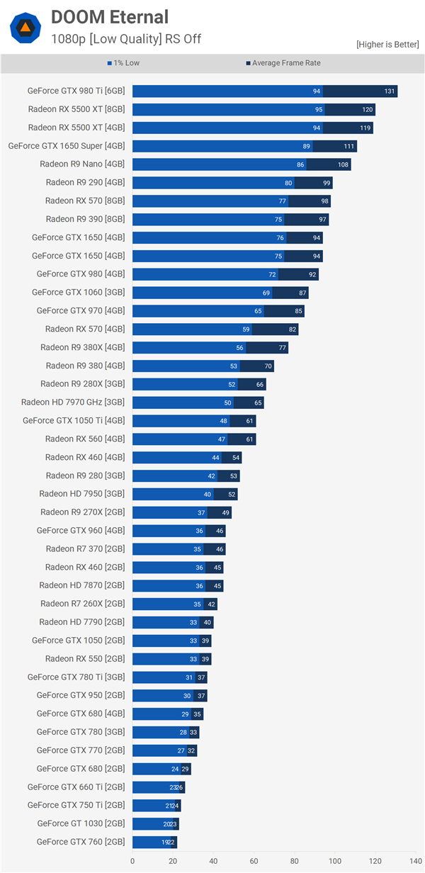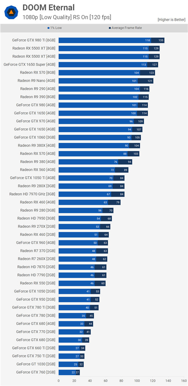 当然,30fps对毁灭战士这样的游戏来说是不够的,以60fps为界限的话,那么RX 550及以上的显卡就可以了,而HD 7790这样发布于2013年的低端卡都可以跑到61fps。