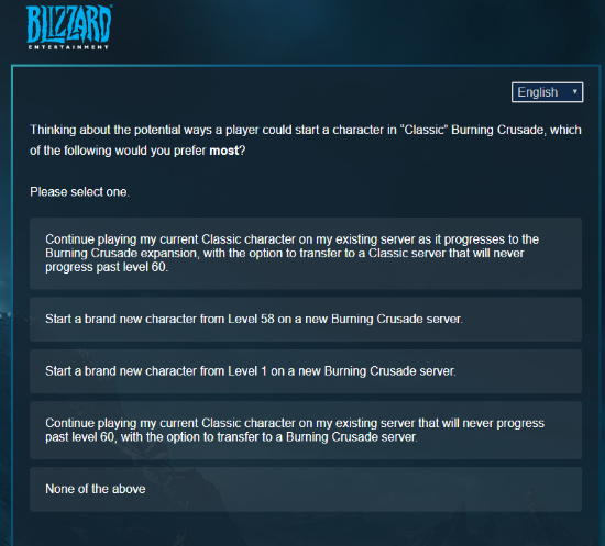 日前网友曝光了一份疑似暴雪内部的问卷调查,征询玩家对TBC《燃烧的远征》资料片的看法,官方给出了四种可能的玩法选项: