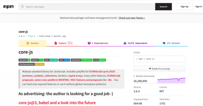 问题是,丹尼斯写程序也很彪悍,他是 JavaScript 的模块化标准库 core-js 的作者,这个库通过 npm 软件包管理器下载,每周居然高达 2600 万次。[3] 甚至连苹果公司的网络服务,也用到了这个库。[4]