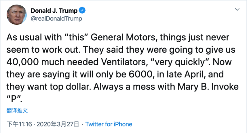 特朗普当天在社交媒体炮轰通用这一美国最大汽车制造商,称通用原本承诺“很快”会提供4万台呼吸器,而“现在他们说到4月底只有6000台。他们只想抬价。”特朗普批评通用汽车首席执行官玛丽·巴拉(Mary Barra)“总是一团糟”。