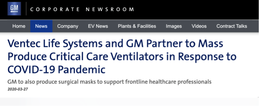 通用汽车随后在一份声明中宣布,正在与医疗设备制造商Ventec合作,将安排1000名工人在印第安纳州科科莫工厂生产呼吸机,预计从4月开始每月将生产超过10,000台呼吸机。
