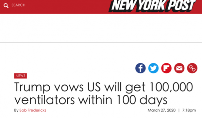据《纽约邮报》报道,特朗普表示,“在接下来的100天,我们要么能生产10万台设备,要么能获得10万台设备”,“在未来的100天时间里,美国制造或获得的呼吸机将是正常情况下全年总量的3倍之多。我们准备得很充分。”