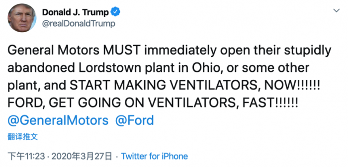 除了要求通用汽车公司,特朗普也喊话福特公司赶快行动起来。他用大写字母写道:“立刻开造呼吸机,现在!福特,动起来造呼吸机,快!”