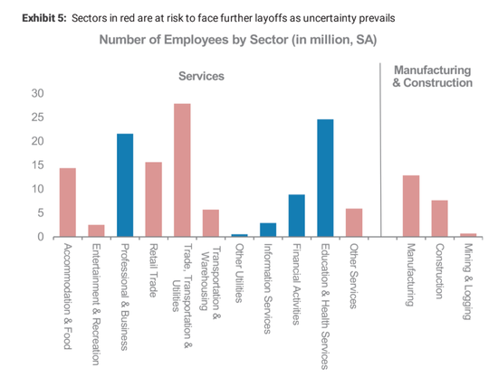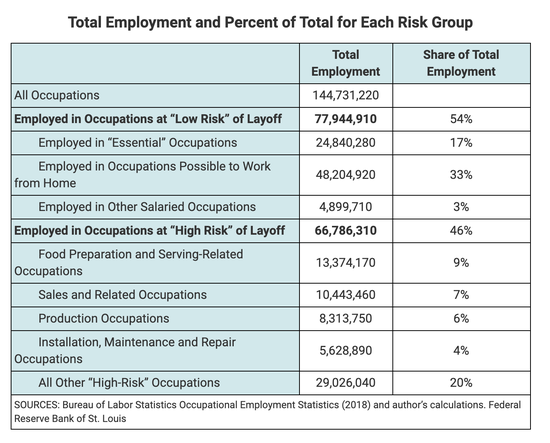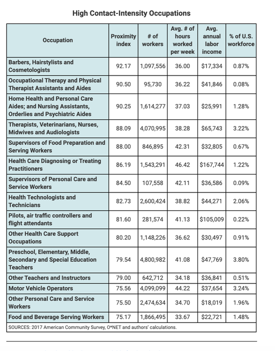 另一篇博客文章是由经济学家费尔南多•莱博维奇(Fernando Leibovici)、安娜•玛丽亚•圣塔克里乌(Ana Maria Santacreu)和马修•费明力蒂(Matthew Famiglietti)撰写,重点关注接触密集型职业的工人数量,他们发现总共有2730万个工人符合这一类型:其中包括理发师,发型师等。