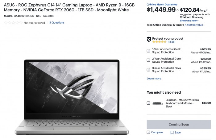作为一款高端游戏本产品,华硕ROG Zephyrus G14的定价相当合理,不过百思买并未透露发货日期,仅显示Coming Soon。
