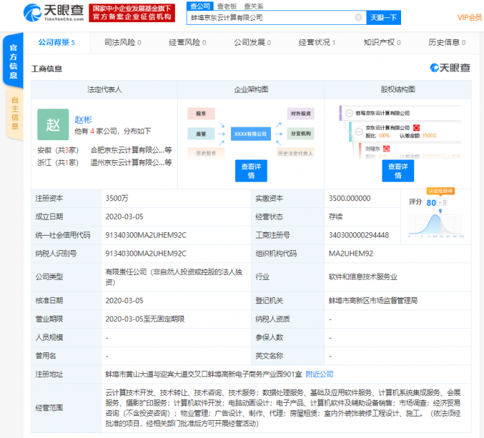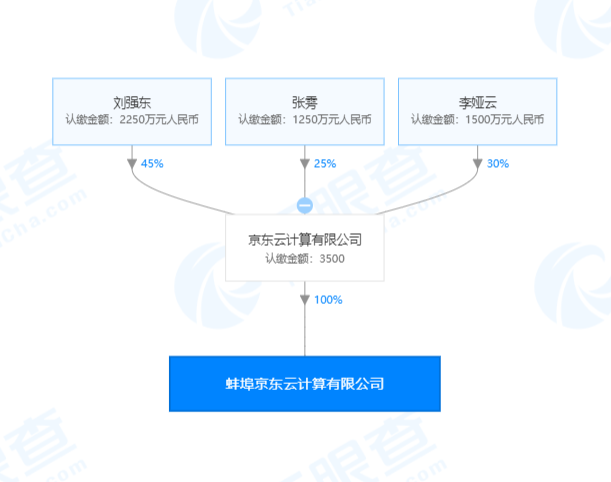 天眼查数据显示,近日,蚌埠京东云计算有限公司成立,该公司注册资本3500万,法定代表人为京东云与AI事业部华东区总经理赵彬,公司经营范围包括云计算技术开发、技术转让、技术咨询、技术服务;数据处理服务、基础及应用软件服务、计算机系统集成服务等,由京东云计算有限公司全资控股,后者的第一大股东为刘强东,持股比例为45%。