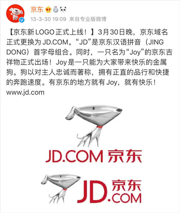 对于京东来说,今天是个特别的日子。7年前的今天,2013年3月30日,京东域名正式更换为JD.COM。同时,一只名为“joy”的京东吉祥物正式出场。当时,京东表示,Joy是一只能为大家带来快乐的金属狗,狗以对主人忠诚而著称,拥有正直的品行和快捷的奔跑速度。