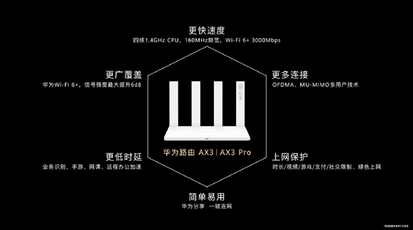 性能方面,华为AX3系列路由器的无线速度可达3000Mbps,支持160MHz频宽,针对中国家庭墙多壁厚的特点,能够实现多穿一堵墙。