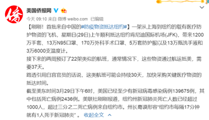《侨报》称,一架从上海到纽约的载有医疗防护物资的飞机,29日顺利抵达纽约肯尼迪国际机场,该架飞机载有1200万副手套、13万N95口罩、170万外科手术口罩和5万套防护服等。