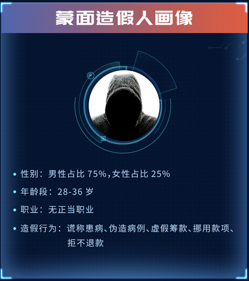 报告显示,水滴筹在过去的一年共收到大病求助申请超过80万个,其中34942个疑似不合规求助申请在风控环节被发现,经调查核实,1961项恶意筹款申请被终止,这些案例占平台全年筹款案例的0.2%。在平台已发现的“蒙面造假人”中,男性占比75%,女性占比25%,年龄集中在28岁到36岁,基本无正当职业。
